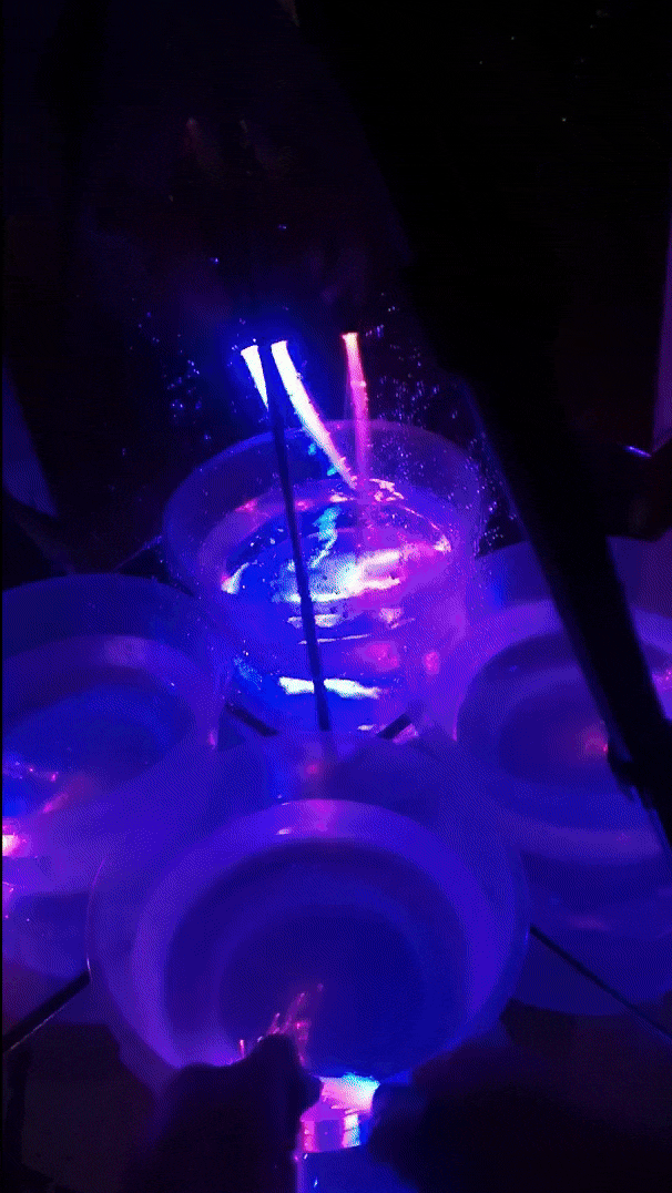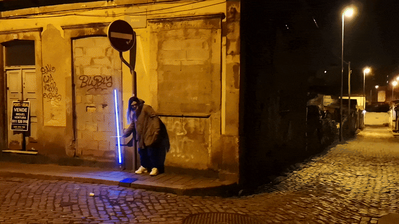 I move through the space with an LED stripe attached to a simple broomstick. The first few rounds are about rhythm and awareness. Running, adjusting, getting familiar with the environment, because in the darkness you never fully know what surrounds you.